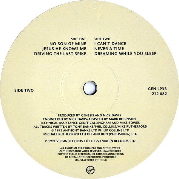 Identical to We Can't Dance but entirely different Matrix/Runout structure. Inner sleeve does not contain the second catalog numbers (212082-8A and 212082-8B)