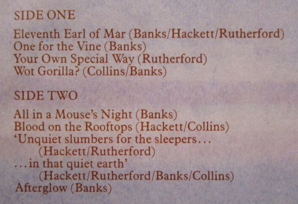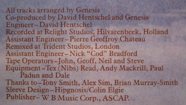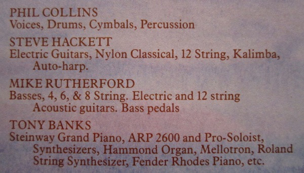 - Piano [Steinway Grand], Electric Piano [Fender Rhodes], Organ [Hammond], Synthesizer [Arp 2600, Pro-soloist, Roland String], Mellotron – Tony Banks