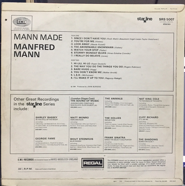 Backsleeve has notes in right above corner : " File under POPULAR : Pop Groups" and in right below corner : "6911 TPS Printed and made by Garrod & Lofthouse Ltd. Patent No. 943.895 SRS 5007".