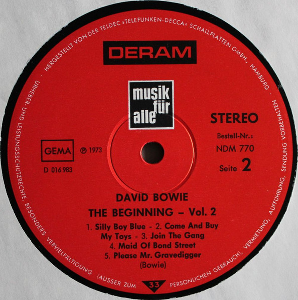 Quite possibly the first pressing of this compilation, due to the label design, machine-stamped matrices on runouts and the absence of the catalog number found on subsequent pressings, such as David Bowie - The Beginning - Vol. 2.