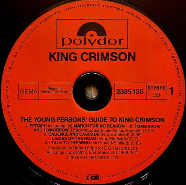 The subtitles of "Epitaph", "Moonchild" & "In The Court Of The Crimson King" are mentioned on the label, however "Moonchild" is edited down to part a. "The Dream" (2:24).
