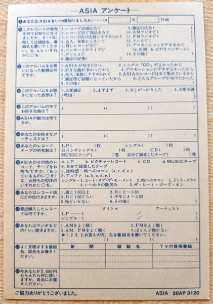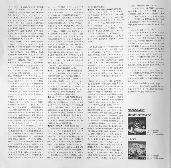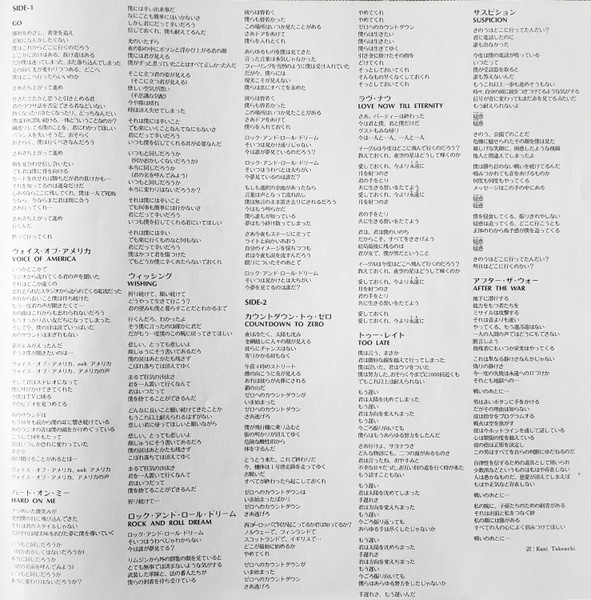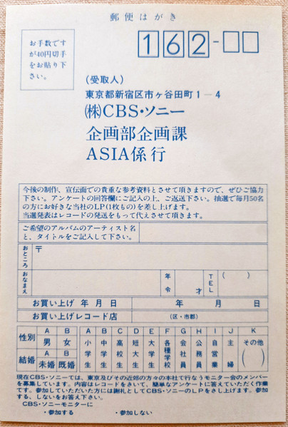 with obi cap, insert, and a sheet 28X28cm of stickers (on lower right corner of sticker sheet: NOT FOR SALE CBS/SONY INC)