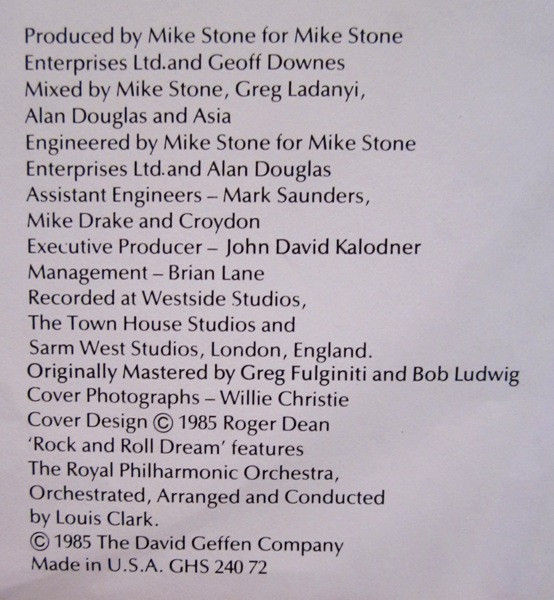 - Mixed By – Alan Douglas (2), Asia (2), Greg Ladanyi, Mike Stone