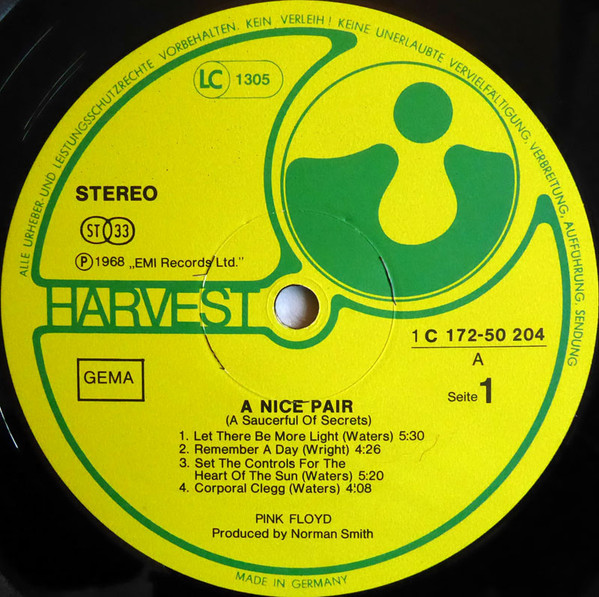 Different labels compared to A Nice Pair with same cat. no.: Rim text half around label in German language and "Made in Germany".