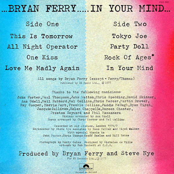 Thanks to John Porter, Paul Thompson, John Wetton, Chris Spedding, David Skinner, Ann Odell, Neil Hubbard, Mel Collins, Chris Mercer, Martin Drover, Ray Cooper, Morris Pert, Frankie Collins, Paddie McHugh, Dyan Birch, Jacquie Sullivan, Helen Chappele, Doreen Chanter, Preston Hayward and Phil Manzanera