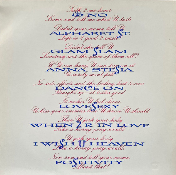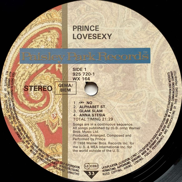 Lovesexy: (labels with 'G.B. only' publisher credits & additional credits to Prince)