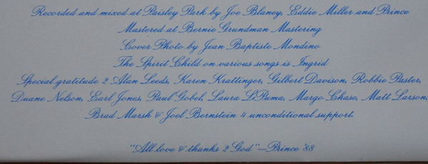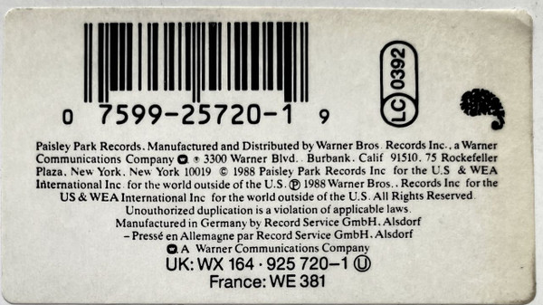 © 1988 Paisley Park Records Inc for the U.S. & WEA International Inc for the world outside of the U S ℗ 1988 Warner Bros Records Inc for the US & WEA International Inc for the world outside of the U S. Manufactured in Germany by Record Service GmbH, Alsdorf - Pressé en Allemagne par Record Service GmbH, Alsdorf [Warner 'W' logo] A Warner Communications Company