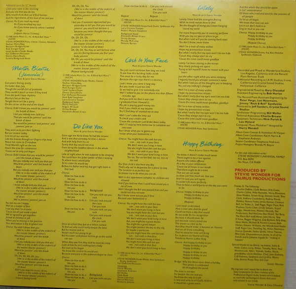 - Drums – Stevie Wonder (tracks: A2 to A4, B2 to B3, B5)