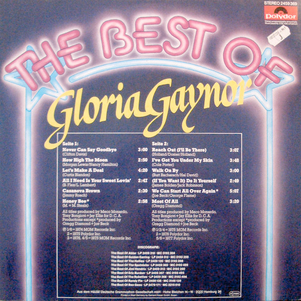 Late 1970s/early 1980s reissue of The Best Of Gloria Gaynor with new package design and catalogue number.