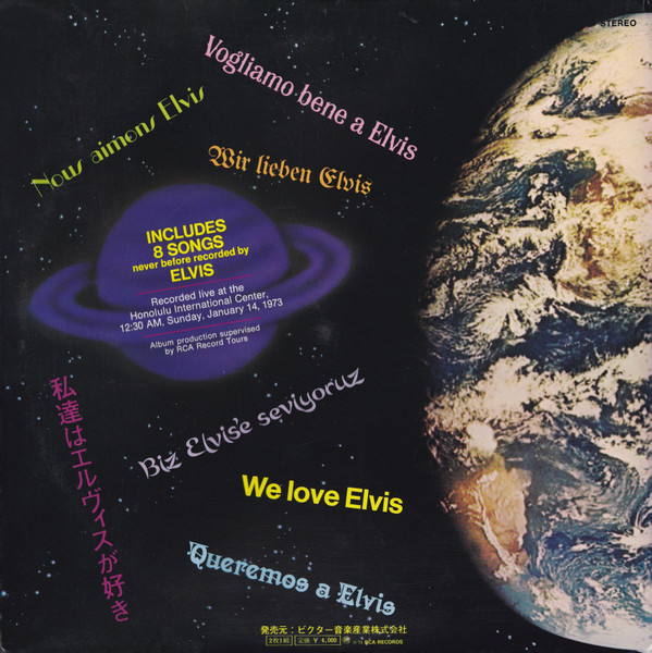 2nd Japanese pressing, lavishly packaged in gatefold cover with integrated booklet featuring color photos, Japanese liner notes and English lyrics. Blue / red / black obi. Similar package to Elvis Presley - Aloha From Hawaii Via Satellite, which came later, except for the manufacturer, price and obi color.