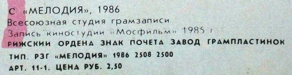 Тип. РЗГ «Мелодия» 1986 2508 2500