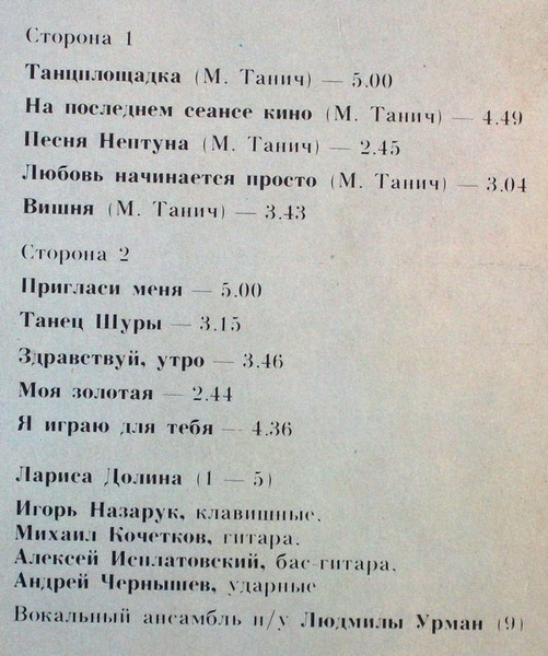 - Vocals – Лариса Долина (tracks: А.1 to А.5)