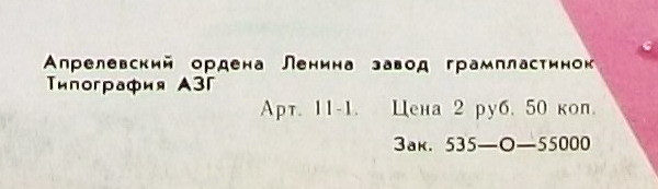 - Pressed By – Апрелевский Завод Грампластинок