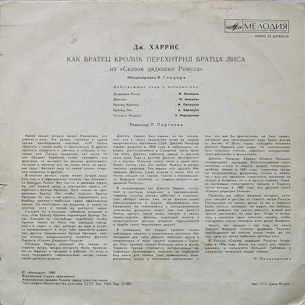- Voice Actor [Дядюшка Римус] – Н. Литвинов*