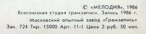 Всесоюзная студия грамзаписи. Запись 1986 г.