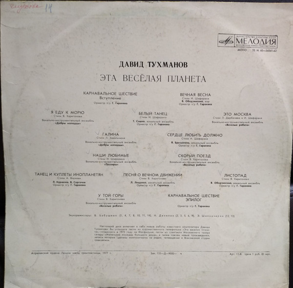 - Lyrics By – А. Внуков (треков: B3), В. Харитонов* (треков: A3, B2, B4 To B6), И. Шаферан* (треков: A2, A4, A5, A7, B1), Л. Дербенев* (треков: A5), Л. Завальнюк* (треков: A6)