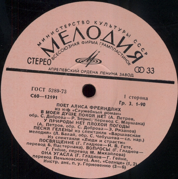 - Производитель грампластинки – Апрелевский Завод Грампластинок