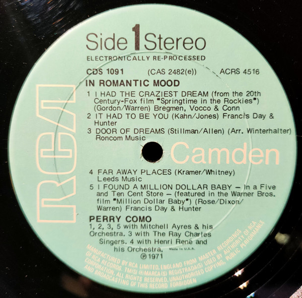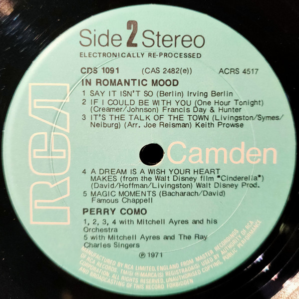 Title on sleeve is 'Perry Como Sings' title on label is 'In Romantic Mood'.