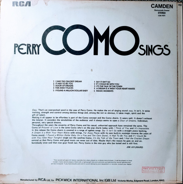 Manufactured by RCA Ltd for Pickwick International Inc (GB) Ltd Victoria Works, Edgware Road, London, NW2