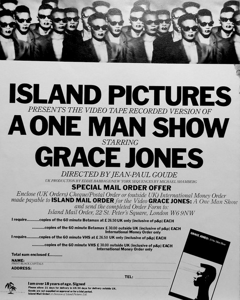 Some copies also come with a three-page foldout insert, which contains a special mail order offer for the Betamax or VHS video tape version of "Island Pictures presents the video tape recorded version of A One Man Show starring Grace Jones", directed by Jean-Paul Goude, featuring UK footage and sequences recorded in New York (see images).