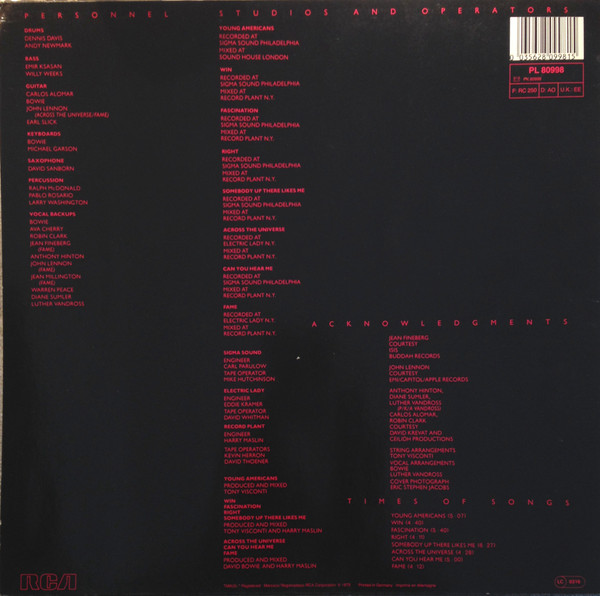- Producer – David Bowie (треков: B2 to B4), Harry Maslin (треков: A2 to B4), Tony Visconti (треков: A2 to B1)
