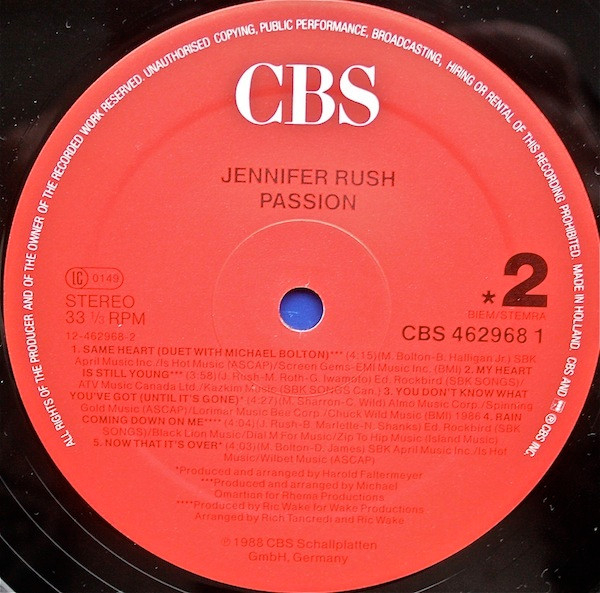 ℗ 1988 CBS Schallplatten GmbH, Germany/ © 1988 CBS Schallplatten GmbH, Germany/CBS and [CBS logo]® CBS Inc./Printed in Holland/Imprimé en Hollande/Distribution CBS Records/CBS Disques S.A.