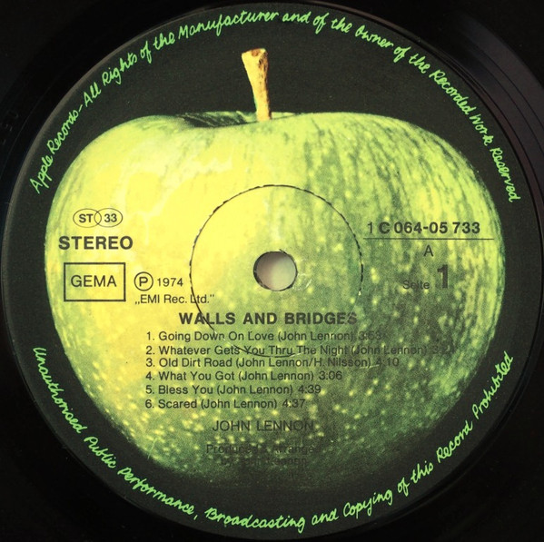 John Lennon - Walls And Bridges - Text on label rim in artistic font style.