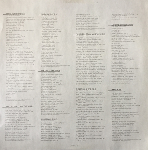 - Written-By – "Stix" Hooper (tracks: B4), B.B. King (tracks: B2, B3), Joe Sample (tracks: A1, A2, A3, A4, B1), Will Jennings, Wilton Felder (tracks: B5)