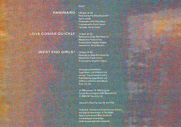 Suburbia, Paninaro and Love Comes Quickly are digital recordings.
