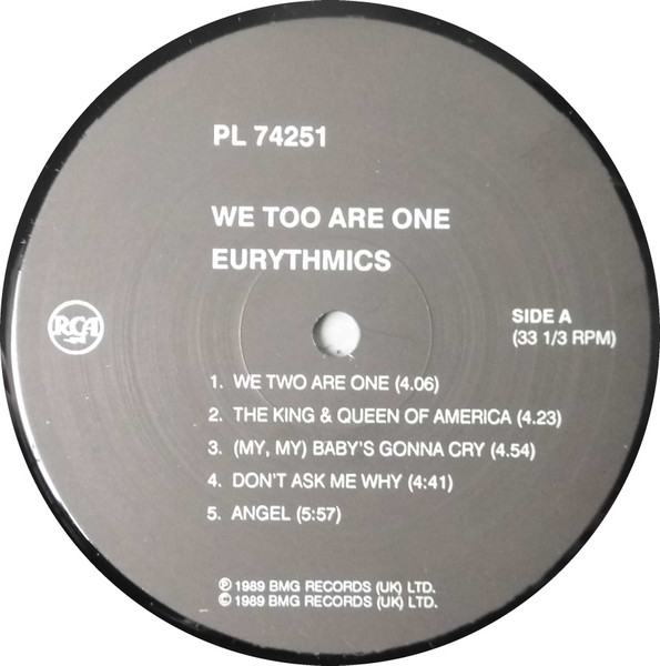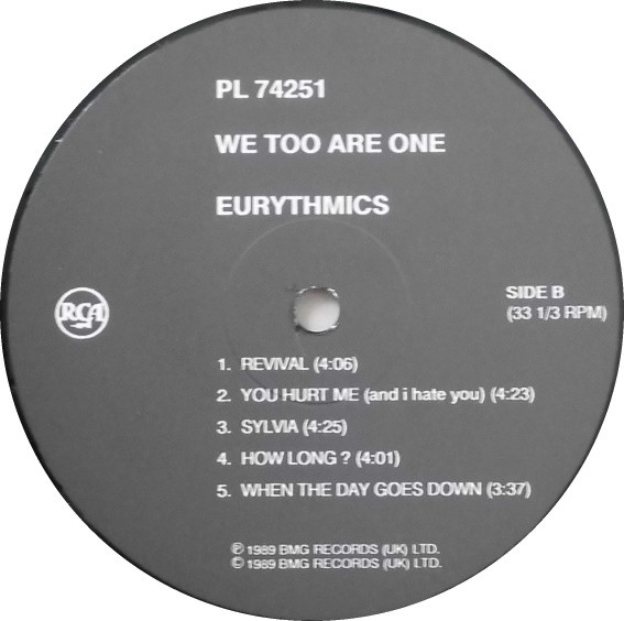 Track time on label side A is incorrect (1,2,4,5) and from side B (4,5). Is other to this release Eurythmics - We Too Are One.