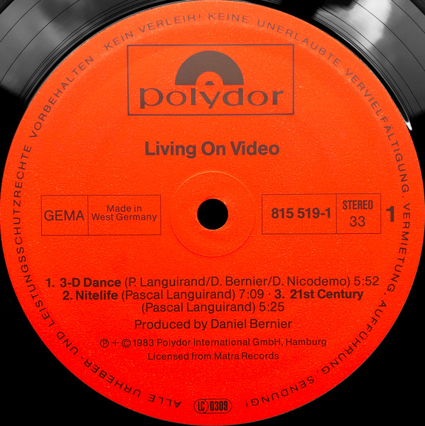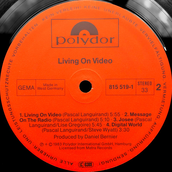Some copies may include a "Including The Single-Hits "Living On Video" and "Message On The Radio" 815 519-1 Y" hype sticker on sleeve.