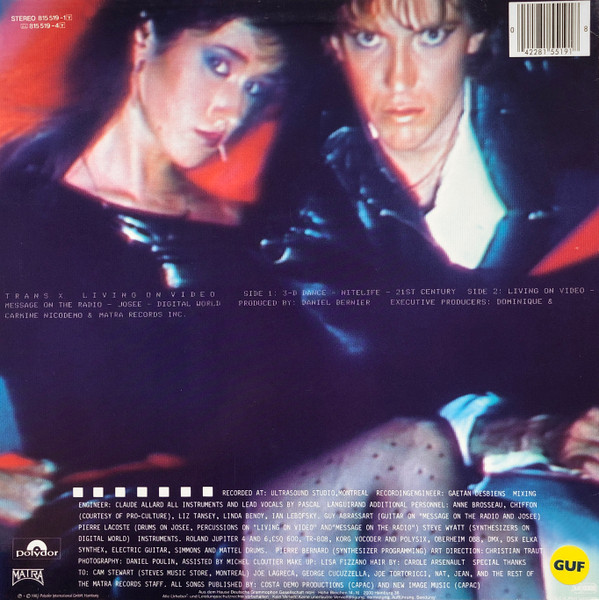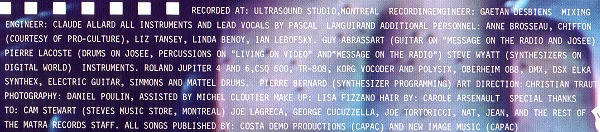 Instruments: Roland Jupiter 4 and 6, CSQ 600, TR-808, Korg Vocoder and Polysix, Oberheim OB8, DMX, DSX Elka Synthex, Electric guitar, Simmons and Mattel drums.