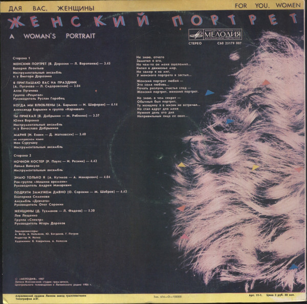 Женский ПортретEnsemble – Инструментальный Ансамбль П/У В. Дорохина*Lyrics By – Л. Воропаева*Music By – В. Дорохин* |