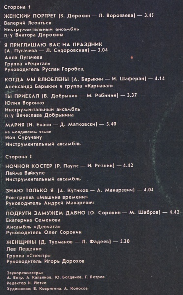 ЖенщиныEnsemble – СпектрLeader – Игорь ДороховLyrics By – Л. Фадеев*Music By – Д. Тухманов* |
