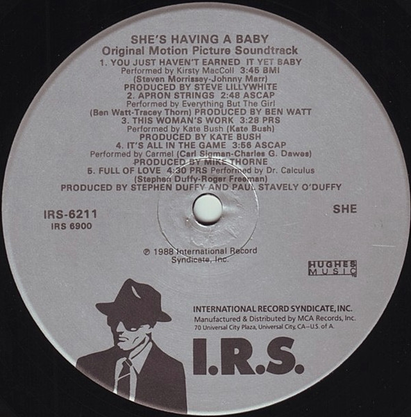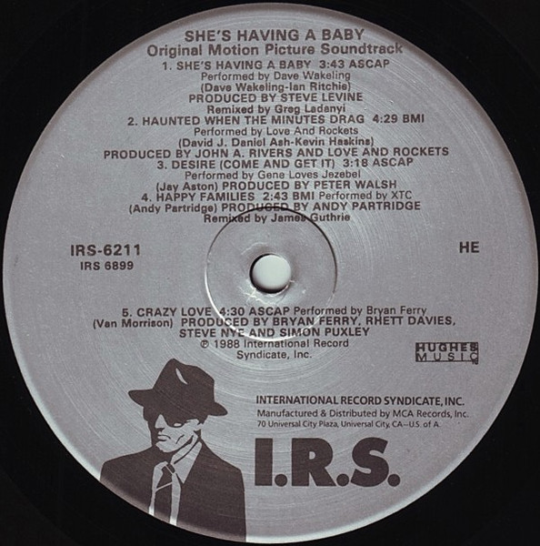 Various - She's Having A Baby (Original Motion Picture Soundtrack) is the MCA Pressing Plant, Pinckneyville pressing, as indicated by ◈-P-◈ stamped in the runouts. The side indicators on the labels (HE and SHE) are below the matrix numbers to the left of the spindle hole, and the Hughes Music logo is prominently displayed to the right of the spindle hole.